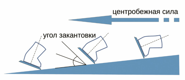 Углы закантовки: слабый (сноуборд проскальзывает); эффективный, оптимальный для данной скорости и траектории (сноуборд уверенно упирается в наст); критический, запредельный (происходит потеря контакта с настом, следствием чего является срыв доски и падение)