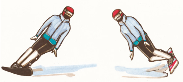 Сформировать первое представление о заклоне у спортсмена можно в уже известном нам упражнении J-поворот, в котором следует исключить загрузку. Более того, за счет заклона формируется и представление о резаном чистом ведении дуги в повороте без сброса хвоста. После непродолжительной работы J-поворотами следует перейти к сопряженным дугам на небольшом уклоне, совершая все повороты заклонами с произвольным радиусом, а перекантовку осуществлять за счет переваливания всем телом с одного рабочего канта на другой. Таким же способом будущему гонщику привьется понимание, как можно за счет более закрытой или открытой резаной дуги контролировать скорость, без помощи сброса хвоста или панического торможения «бульдозером» после того, как совершил пару дуг и разогнался слишком быстро (рис. 8, 9).