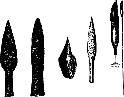 Наконечник, снабженный стержнем, представляет во всяком случае более совершенный тип и встречается как у стрел, так и у дротиков. Нижние углы его в этом случае несколько стачиваются внутрь, почему и получается характерная форма этих наконечников. Сточенные нижние углы могут быть острые, отсечены горизонтально, закруглены или выступать за стержень.