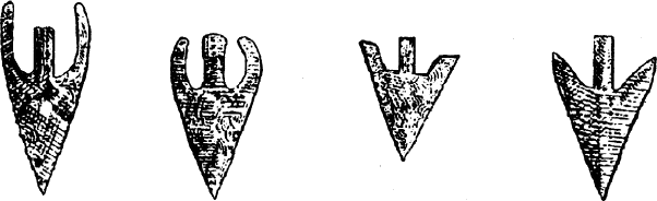 Самая обыкновенная форма наконечников – это косоугольник, который шлифовкой боковых углов получает форму листа. Треугольная форма требует небольшого стержня для насадки на рукоять, выделка которого была довольно затруднительна. Камни, обтесанные в виде косоугольника и имеющие 6 см длины, вероятно, служили для наконечников дротиков, и некоторые из них так симметрично отделаны, что могут быть совершенно безразлично насажены на дерево с той или другой стороны большой оси. Другие имеют круглое основание; в таком случае часть, занимаемая острием, очень мала, и последнее образуется сходящимися под очень острым углом гранями. Многие наконечники стрел не превышают 2 см длины и имеют миндалевидную форму. Вставленный в расщелину деревянной рукоятки, где он утверждался древесной смолой или камедью и связками, такой наконечник держался очень крепко.