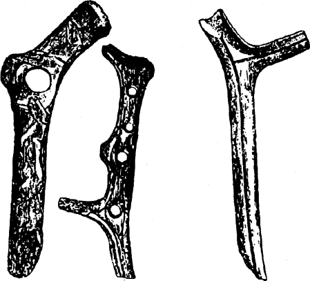 Кроме отверстия, через которое вливали металл, нужно было составлять в форме одну или несколько дыр для выхода воздуха. Отверстие, имевшее форму воронки, заделать было не трудно, но дыры часто оставляли следы, уничтожить которые было почти невозможно. Кузнецы бронзового периода, по-видимому, совершенно не умели просверливать металл: отверстия (например, в мечах для прохода гвоздей и прочее) были отлиты, а не просверлены. Подобным же образом отлиты все орнаменты, круги, спирали и пр., встречающиеся на бронзовых предметах. Хотя линии эти проведены довольно правильно, однако видно, что они сделаны от руки и что циркуль был в то время еще неизвестен. Паяние в бронзовом веке и даже в начале железного было, как кажется, вовсе неизвестно.