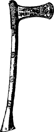Боевые топоры различаются трех форм. У одних клинок образует двойную косу, лезвие которой имеет вид полумесяца с прямоугольно отсеченными концами для закрепления привязей. Рукоять прикреплялась у основания и оконечностей, сохранивших еще отверстия для заклепок. Другие топоры были гораздо тоньше и площе; клинок, более или менее закругленный, с помощью стержня насаживался под прямым углом на деревянную рукоять. У топоров третьей формы клинок с помощью растительных связок закреплялся привязями к согнутой под углом рукояти – соединение, несколько напоминающее такое же у долот из шлифованного камня.
