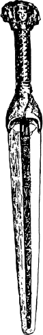 Гораздо проще кинжал Луврского музея. Его листообразный клинок имеет выпуклое ребро, вдоль всего клинка идет желобок. В верхней части клинка красиво суженный по сторонам стержень облицован деревянными пластинками, образующими саму рукоять кинжала.