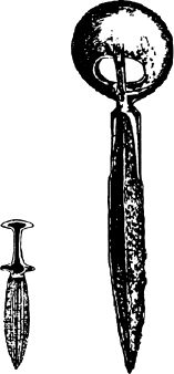 Существует замечательная форма кинжалов, в которой рукоятка расширяется в виде павлиньего хвоста, образуя диск с двумя просверленными отверстиями. Диск этот упирался в ладонь, а в отверстия проходили указательный и средний пальцы. Иногда, впрочем, их помещали просто вдоль клинка, в верхней части которого сделаны были небольшие выемки. Подобный кинжал принадлежал и царице Аххотпу. Он из желтоватой, крайне тяжелой бронзы; рукоять серебряная.