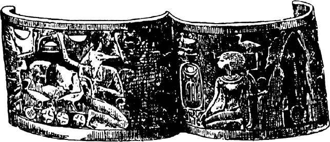 В Фивах найден был бронзовый нож довольно оригинальной формы. У небольших ножей Туринского музея клинок и рукоять из железа. У одного из них рукоятка слоновой кости имеет желобки, а на клинке помещена надпись – грубое подражание иероглифам и греческим письменам. Надпись эта никак не ранее первых веков по Р. Х. Вероятно, к этому же времени, когда религиозные запрещения не имели уже такого сильного влияния, относятся и сами железные ножи.