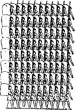 На рисунке изображена египетская фаланга, как она была в сражении при Кодсху. Воины вооружены копьями и щитами, верхняя часть которых закруглена и имеет небольшое отверстие для зрения.