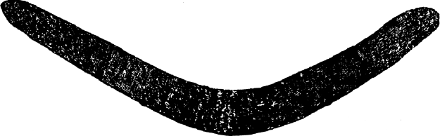 Бумеранг дикарей имеет до 91,5 см длины при ширине до 6 см, а толщиной около 2 см. С первого взгляда он похож на кривой деревянный меч грубой работы. Крепко придерживая за один конец правой рукой, его бросают вверх или косвенно вниз, к земле. В первом случае бумеранг летит с сильным вращательным движением, обусловливаемым его формой, и, достигнув значительной высоты, разом поворачивает назад, к месту, откуда был брошен, описывая эллиптическую дугу. Если же его бросают вниз, об землю, то он отскакивает по прямой линии и продолжает движение рикошетом.