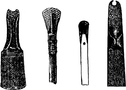 А. Плоские кельты. Они представляют самый простой вид топора и, должно быть, плавились первоначально по образцу кельтов из шлифованного камня, подобно которым и соединялись с рукоятью.