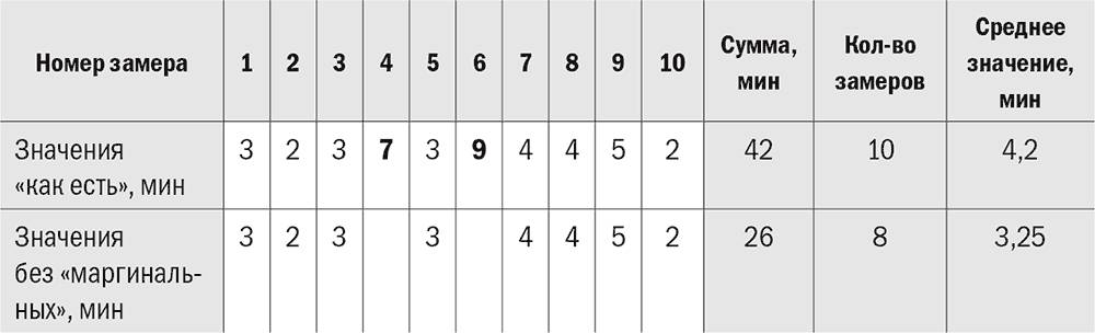 Первая строчка учитывает все замеры, во второй исключены маргинальные значения четвертого и шестого замеров, явно выбивающихся из общего тренда. Вроде бы все платежки одинаковые, но бывает, что с некоторыми возникают определенные проблемы. Например, для платежей в бюджет нужно указать коды ОКАТО и КБК, что занимает дополнительное время. Но так как эти случаи – исключение, они не должны искажать общую картину.