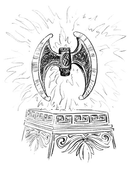 Миновав еще два поворота, он оказался в просторном помещении, по периметру которого стояли чаши с горящим в них огнем. У дальней стены располагался массивный золотой постамент. Прямо над ним в невесомости парило широкое, двустороннее, подобно распахнутым крыльям летучей мыши, лезвие топора, по которому, искря, пробегали молнии.