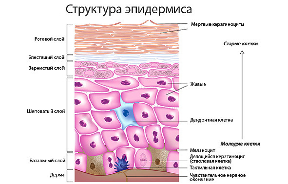 Сам роговой слой кожи – очень тонкий, он является частью эпидермиса. Если посмотреть детальнее на эпидермис мы видим, что он в свою очередь состоит из молодых и старых клеток, которые находятся в постоянном движении.