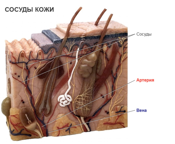Помимо клеток эпидермиса, мы видим очень много других клеток, потовые железы, нервные окончания, жировая клетчатка, а также, кровеносные сосуды, которые позже перетекают в артерии и вены.