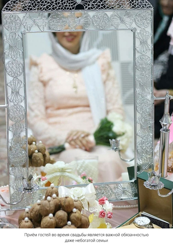 Ко времени совершения брачной церемонии, невесту усаживают перед большим зеркалом в серебряной или золотой оправе. По обеим сторонам зеркала стоят золотые, серебряные или хрустальные подсвечники с зажженными свечами из цветного воска. Зеркало и подсвечники – подарки от жениха, символизирующие собой счастье и чистоту отношений, ожидающие невесту в совместной жизни. На коленях невеста держит раскрытый Коран, а вокруг неё – море прекрасных цветов, источающих благоухание. С головы до пят невеста укутана в вышитое золотой нитью тонкое покрывало, у ног её постелен молитвенный коврик в виде квадратной кашемировой шали, тоже расшитой золотой нитью и настоящим жемчугом. По его углам расставлены золочёные подносы, на которых красиво разложен крупно нарезанный овечий сыр, зелень и ароматные травы, а также специально испечённые круглые лепёшки с поэтическими благопожеланиями, выложенными цветными зернышками кунжута. После церемонии сыр с зеленью и лепешками раздают гостям как символ процветания.