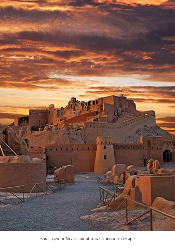 Возраст крепости Бам («Арге-Бам»), выстроенной из глиняных кирпичей, соломы и стволов пальм, составляет около 2 000 лет. Она находится в городе Бам (провинция Керман) и до недавнего времени являлась крупнейшим глинобитным строением в мире.