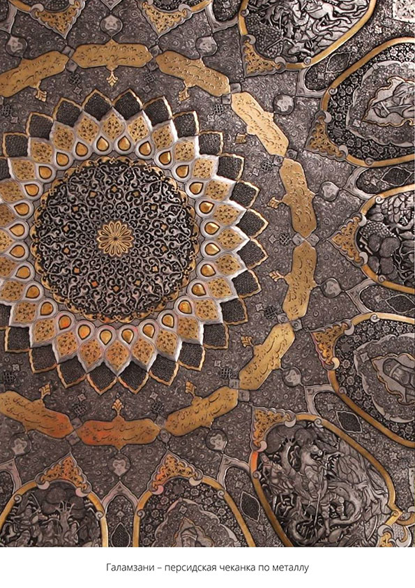 • микрогравировка («сийях-галам») включает традиционные арабески, персидские миниатюры и т.п. Этот вид чеканки предполагает игру мастера со светом и тенью.