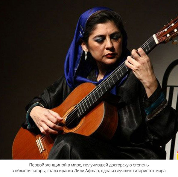 Первой женщиной в мире, получившей докторскую степень в области гитары, стала иранка Лили Афшар, одна из лучших гитаристок мира.