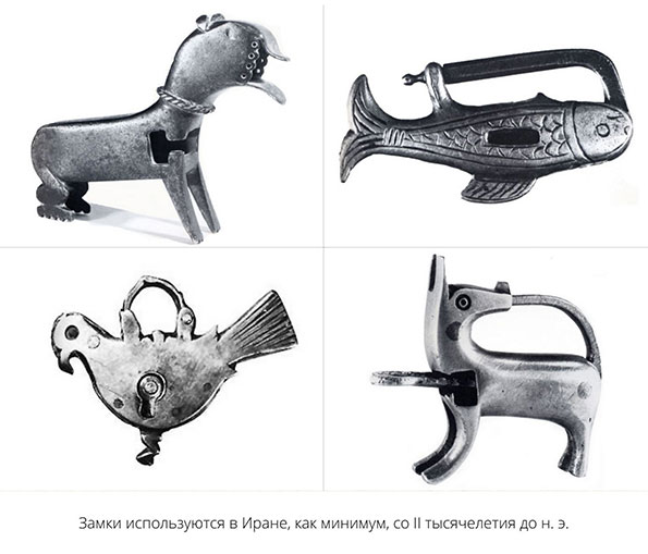 К середине XVI в. иранские мастера достигли вершин мастерства в создании навесных замков. Один из них изготовил 12 стальных замочков с ключами – и каждый из них (вместе с ключиком) мог поместиться в скорлупе фисташки. Но были в истории Ирана и замки-гиганты. Авторы X в. рассказывают о замкè со следующими параметрами: 300 см в ширину и 170 см в диаметре, который «не могли обхватить даже два человека разом».
