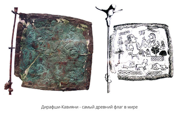 Самым старым из поныне используемых государственных флагов справедливо считается флаг Дании (утвержден в 1219 г.). Однако и Ирану есть, чем похвастаться – именно на его территории был обнаружен, предположительно, самый древний из физически сохранившихся штандартов/флагов. Его обнаружили в 1970-х годах, когда ученые начали раскопки в окрестностях города Шехдад, неподалеку от Кермана (юго-восточный Иран). Тогда, посреди раскаленной пустыни Деште-Лут, был обнаружен целый древний город, существовавший в этих местах в начале III тысячелетия до н. э.