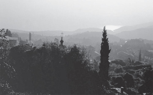 Прозрачные, почти невесомые строения, освещенные первым утренним солнцем; башни, наперегонки с кипарисами тянущиеся к небу; веселые купола и крыши; подернутые дымкой, вырастающие из моря горы; лестницы и длинные переходы, в их лабиринтах исчезают еле слышные шаги; свет, мерцающий в сгущенном воздухе; синеватый ладан и трепет свеч, иконы и хоругви в торжественных процессиях: пурпур и золото, разлившиеся по полям; удлиненные черные фигуры – глаза опущены – поднимающиеся по косогору; плаха и разбросанные по мостовой камилавки; башни и монахи в вихре пламени, каменные ступени в лунном свете; выбеленные временем кости, собранные в общей гробнице; белоснежные простыни, бьющиеся на ветру; овальные подносы, перегруженные лакомствами, возвращаемые почти нетронутыми; кисловатый запах старого кирпича; волны пения и шепот молитв, шум крыльев, журчание вина; покосившиеся кельи и их жители, которые, вместе с ветхими стенами и своей полузабытой религией, осыпаются, уходят во тьму средневековья и выплывают из нее, под глухой звон колоколов, среди благоухания мерцающих лампад. Афон не на небе и не на земле – вертоград Пресвятой Богородицы.