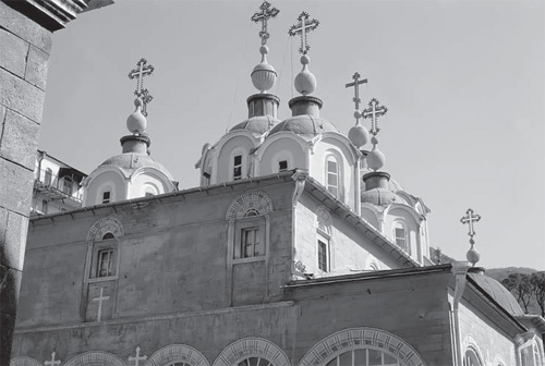 * * *На дороге под самым монастырем нашлась, наконец, тропинка, отходящая влево. Здесь же указатель: «Святой Русик». Через два глубоких оврага переброшены каменные мостики, дальше надо спускаться к морю: зеленые купола все ближе и ближе. Миновав ухоженную масличную рощу и спустившись еще немного ниже, я оказываюсь среди многоэтажных зданий и церквей, обступивших со всех сторон монастырские стены. В прошлом столетии и в начале нынешнего здесь, видимо, жили сотни, если не тысячи, монахов. (А сейчас их не больше двадцати. Пришла бы сюда половина России, если б можно было.) Постройки заброшены, многие разрушились окончательно. Громадная церковь, каких на Афоне мало, закрыта на висячий замок и кажется покинутой.