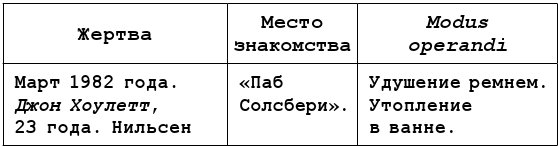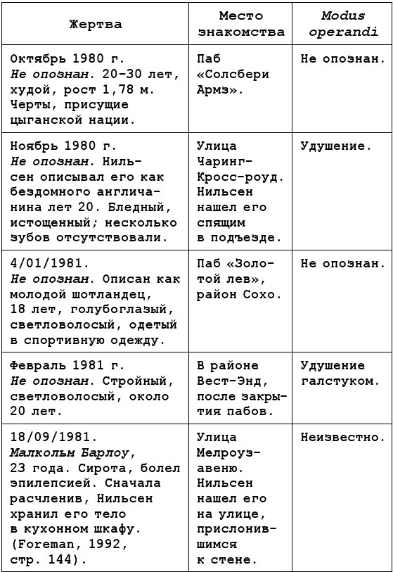 Таблица 2. Жертвы, убитые в доме на Мелроуз-авеню в 1978–1981 годах: пятеро из них были установлены, еще четверо остались неопознанными. Хотя Нильсен утверждал, что убил 15 молодых людей, в тюрьме он признался, что выдумал трех жертв, чтобы соответствовать тому, что он первоначально сообщил полиции.