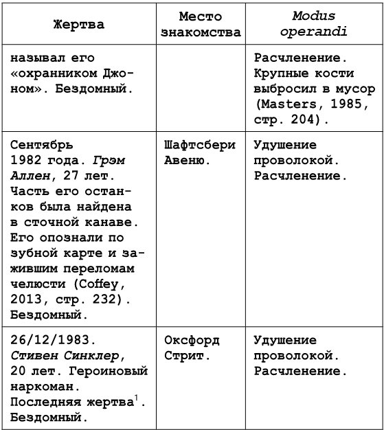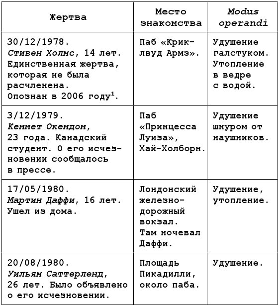 Таблица 1. Жертвы, убитые в Крэнли Гарденс в 1982–1983 годах. Все они были бездомными.[1]