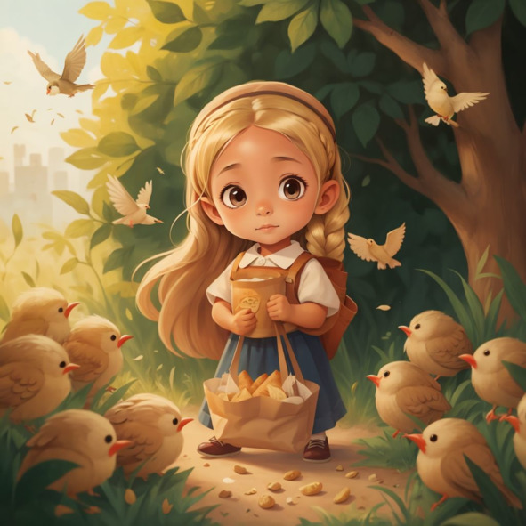 Придя домой девочка попросила у мамы еще хлеба и крупы. Мама с радостью помогла и дала ей большую сумку. На следующее утро Белла пошла в парк со своей новой сумкой. Птицы ждали ее, как всегда. На этот раз у нее было достаточно еды для всех. Птицы радостно щебетали, пока ели.