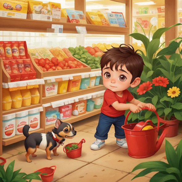 Матео и Бимбо нуждались в инвентаре для разбивки своего огорода. Они пошли в магазин с мамой Матео. Они выбрали семена, почву и садовые инструменты. Матео выбрал ярко-красную лейку. Бимбо обнюхал все, чтобы убедиться, что все идеально. Они также купили перчатки, чтобы руки были чистыми. Матео был взволнован, когда они отправились домой.