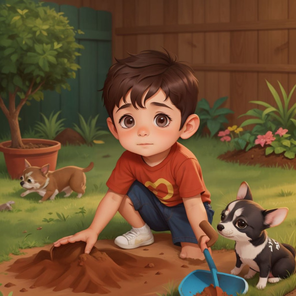 Вернувшись домой, Матео и Бимбо пошли на задний двор. Им нужно было подготовить почву для посадки. Матео использовал маленькую лопату, чтобы вскопать землю. Бимбо помогал, копая лапами. Они усердно трудились, следя за тем, чтобы почва была мягкой и готовой для посадки. Мама Матео наблюдала и давала им советы. Матео и Бимбо устали, но были счастливы.