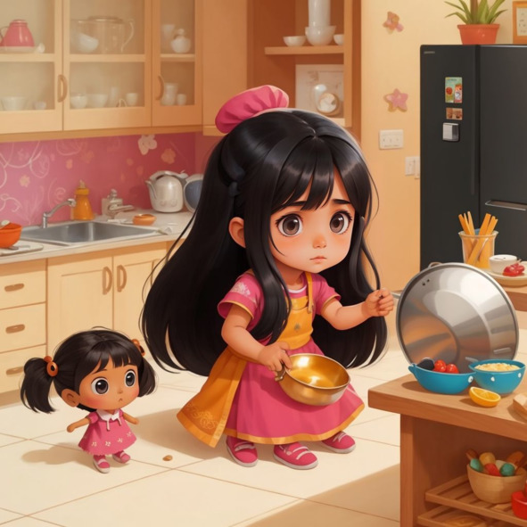 Затем Вайолет решила отвести кукол на кухню. Она осторожно протолкнула коляску через дверной проем. Кухня была полна интересных вещей. Вайолет показала своим куклам блестящие кастрюли и сковородки. Она даже открыла холодильник, чтобы показать им еду внутри.