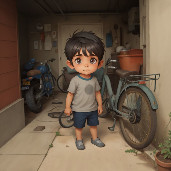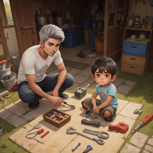 One sunny morning, Connor saw an old bicycle in the garage. It was covered in dust and had flat tires. Connor’s Daddy, Addison, noticed his curiosity. “Would you like to help me fix it?” Addison asked. Connor’s eyes sparkled with excitement. “Yes, Daddy!” he replied eagerly. They rolled the bicycle out into the driveway. It was time for an adventure!