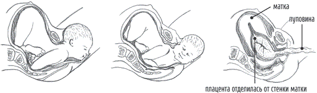 Стадия рождения плода (вторая стадия): Головка ребенка входит во влагалище; может настать момент «передышки», пока матка сжимается вокруг тельца ребенка, ребенок опускается и поворачивается, а затем рождается