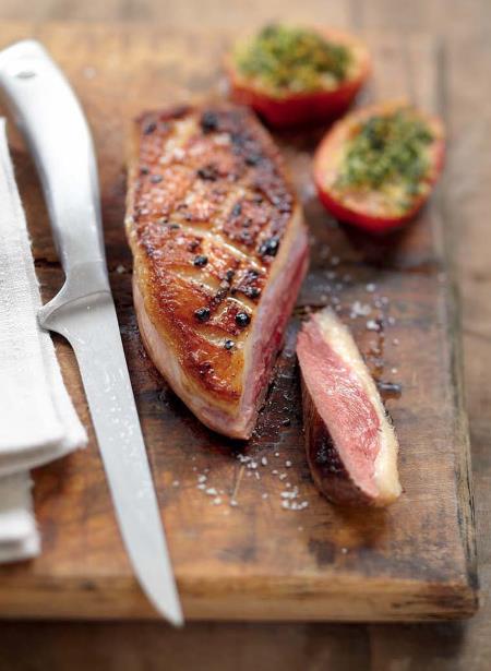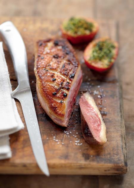 Переверните помидоры, на поджаренную сторону разложите заправку из петрушки и готовьте еще 6–8 минут. Переверните также и утиные грудки и обжаривайте еще 5–10 минут (в зависимости от того, какую степень прожарки предпочитаете).