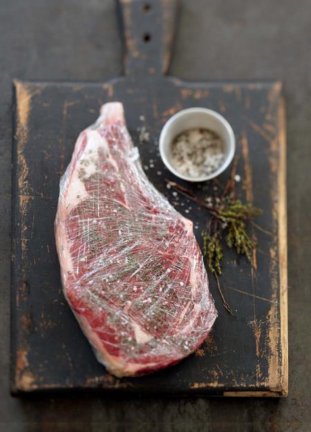 Разложите кусочки мяса на рабочей поверхности. Смажьте со всех сторон смесью из чабера, оливкового масла, соли и перца. Сложите в герметично закрывающуюся емкость и уберите на 4 часа в холодильник.