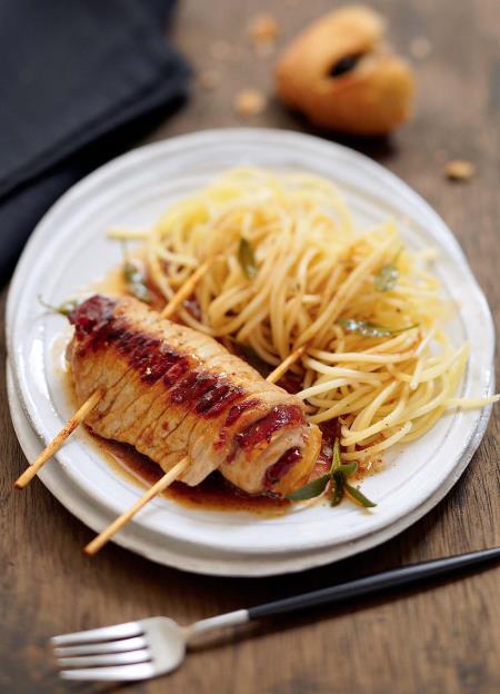 Сверните рулетики и проткните каждый 2 деревянными шпажками, чтобы не развернулись.
