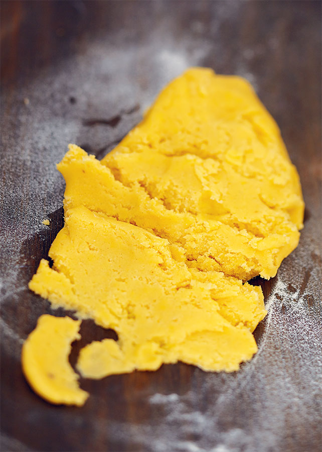 • Выложите тесто на посыпанную мукой рабочую поверхность и разомните ладонью до однородности. Скатайте тесто в шар, заверните в пищевую пленку и уберите в холодильник на 6 часов. Достаньте тесто из холодильника за 20 минут до использования.