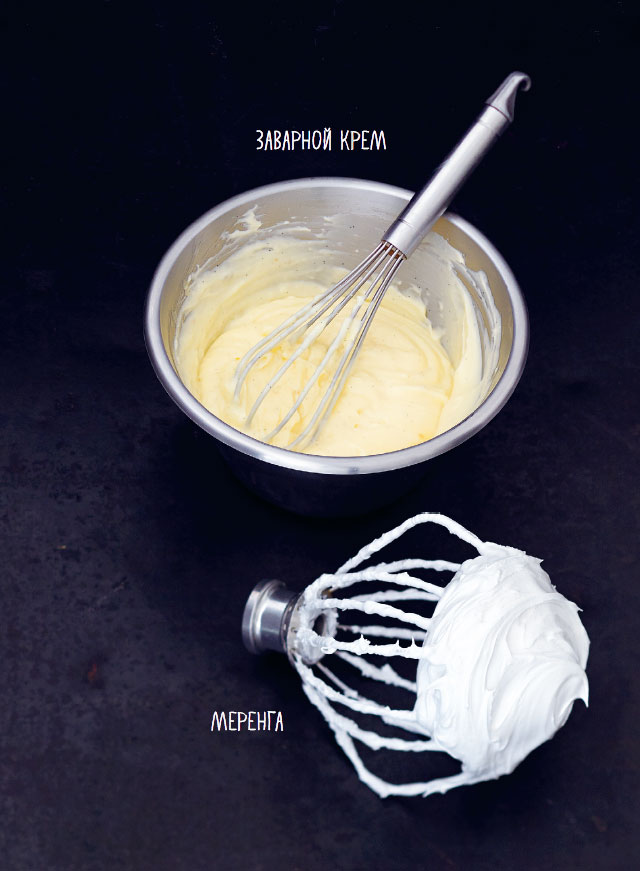 МЕРЕНГАВзбейте в крепкую пену 5 белков со щепоткой соли. Постепенно добавьте 170 г мелкого сахара, продолжая взбивать белки на полной скорости еще 3 минуты. Немного уменьшите скорость миксера, постепенно добавьте 170 г сахарной пудры и взбивайте еще 5 минут. Отсадите меренгу на противень, застеленный пергаментной бумагой или силиконовым ковриком, и выпекайте 1–1,5 часа в разогретой до 110 °C духовке. Достаньте меренгу из духовки и дайте ей постоять при комнатной температуре не меньше 3 часов.