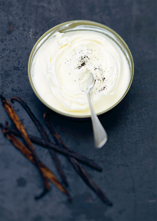 КРЕМ «ШАНТИЛЬИ» С ВАНИЛЬЮВ глубокой миске смешайте 350 мл жирных сливок с 50 мл молока. Уберите миску в холодильник на 2 часа: смесь молока и сливок должна охладиться до 3–4 °C. Разрежьте большой стручок ванили вдоль пополам и выскоблите семена ножом. Добавьте их в охлажденную молочно-сливочную смесь и взбейте миксером на средней скорости. Когда крем начнет густеть, постепенно всыпьте в него 80 г просеянной сахарной пудры и продолжайте взбивать до тех пор, пока не получите крепкую пышную массу (добившись этого, сразу выключите миксер, чтобы взбитые сливки не превратились в масло!).