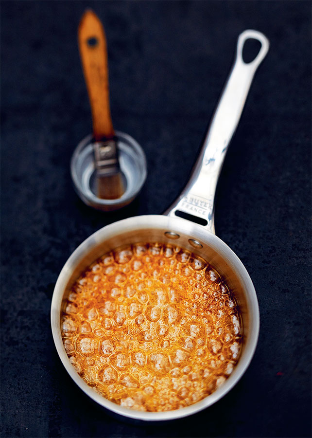 • Готовьте, продолжая регулярно очищать стенки влажной кисточкой, пока сахарный сироп не превратится в карамель. Как только карамель примет желаемый цвет, окуните дно кастрюли в холодную воду, чтобы остановить процесс карамелизации.