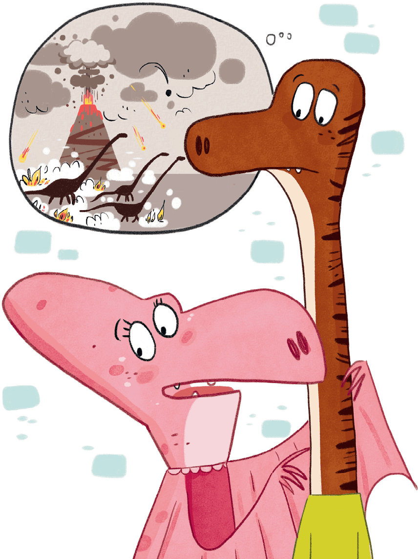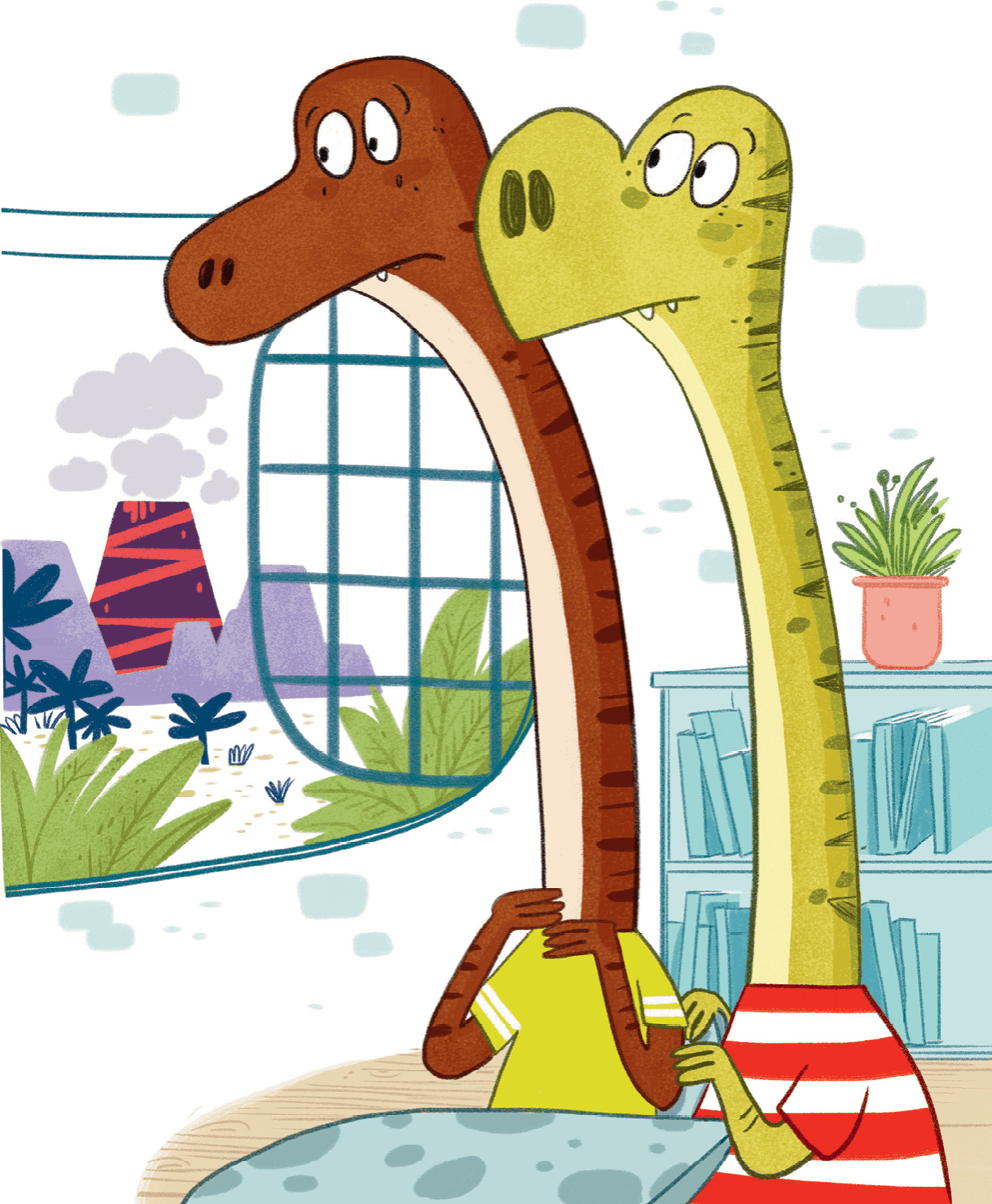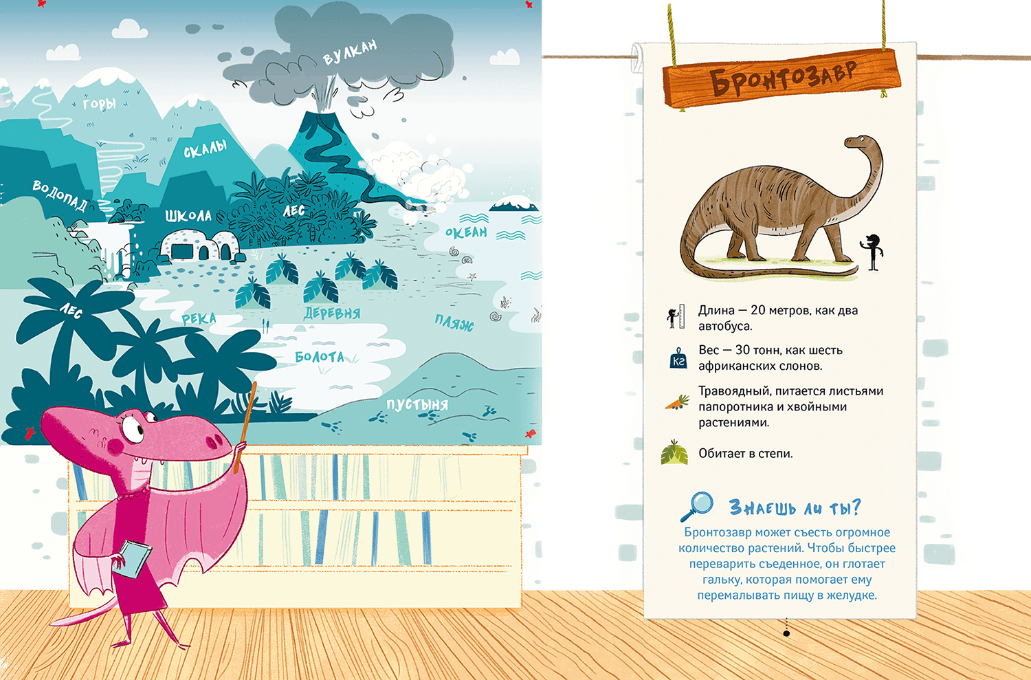 – Ребята, будьте подобрее с Бронто, – попросила она. – Вулкан разрушил его дом, а семья потеряла работу и все вещи. Бронто пришлось расстаться со своими друзьями, чтобы переехать сюда.