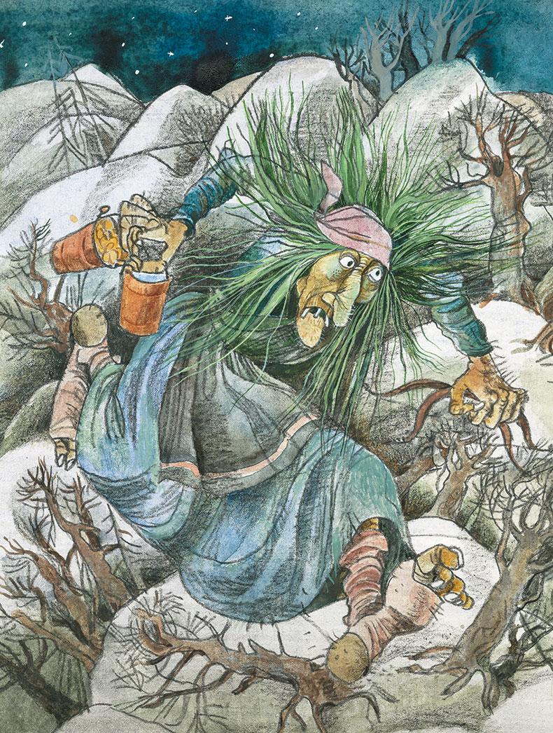 Узнав, в чём дело, она так рассердилась, что выдернула с корнями большую сосну и переломила её о колено, словно это была не столетняя сосна, а сухой прутик. Потом она вырвала у себя из головы длинный зелёный волос и стала им, как верёвкой, ловить мальчика.