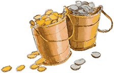 Мальчики набили мешки золотом и серебром, вскинули за плечи стальные луки и, прихватив новые вёдра из блестящей меди, весело зашагали домой.