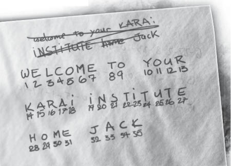 I wrote the banner’s message across the top of the napkin: WELCOME TO YOUR KARAI INSTITUTE HOME, JACK.