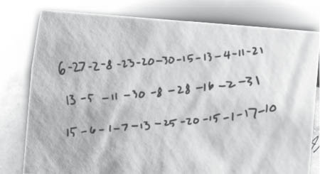 They looked like Lotto numbers. What did they mean? Could it be some kind of code? Maybe an alphabet-number substitution thing. Like A = 1 and B = 2.