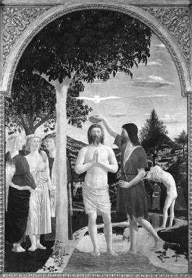Figure 2: This picture is full of symbolism. Jesus stands where the river Jordan ends, symbolising the end of the old covenant and the beginning of the new. He is baptised by John. On the left three figures represent the Trinity, the middle of which (God the Son) looks apprehensively at the scene; He knows it will end in His death (a sepulchre is in the distance). Behind, this a man strips off, ready to be baptised. His colouring is the same as Jesus’, indicating all Christians share in Jesus’ baptism. The overhanging tree represents the love of the Father, the dove represents the Holy Spirit and Jesus Himself represents the Son. The prickly trees in the background represent the Pharisees who pass disapprovingly in the middle distance.
