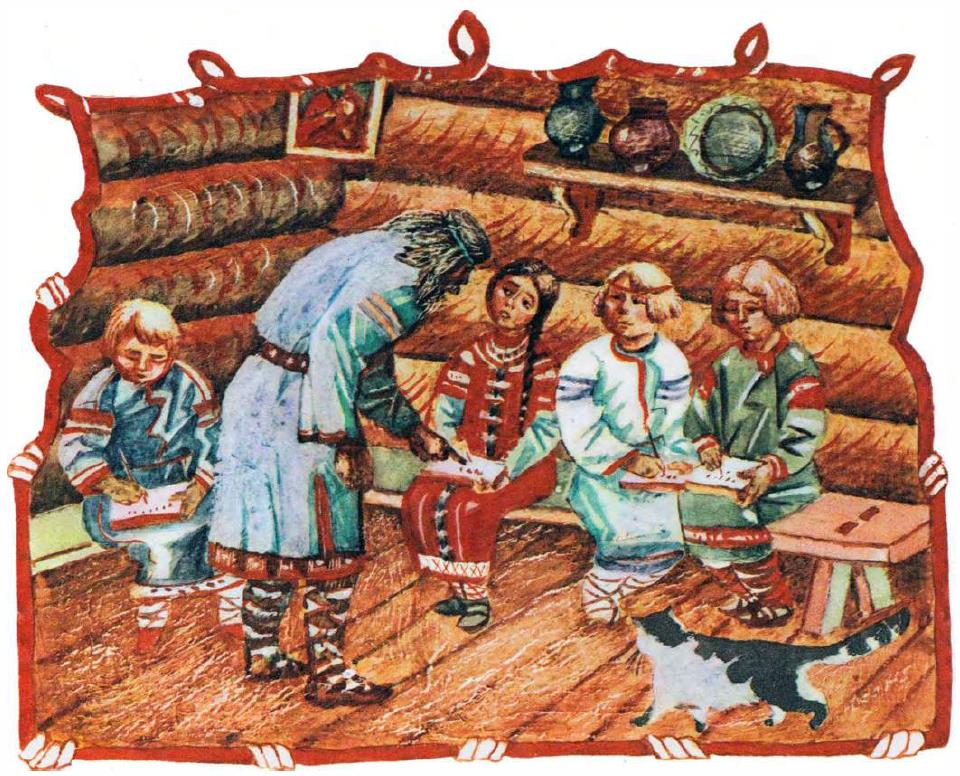 В избе тепло. С утра печка натоплена. В ней горшки со щами да кашей стоят, дожидаются обеда. Вдоль стен – лавки сосновые. На них сидят дети, и сред них – Матвейка, старший сын Моислава Поповича, дедов любимец. У всех учеников в руках церы – дощечки, покрытые мягким воском, на них буквы выводят. У каждого и писало – бронзовая палочка. Один конец острый, чтоб буквы по воску процарапывать, другой – плоский, ошибки стирать.