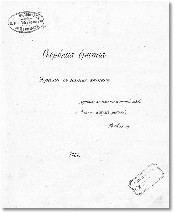 В пьесе, в самой задумке сделать предметом обсуждения литературные нравы и порядки просматривается именно та черта, которая отмечалась едва ли не всеми, писавшими о Боборыкине, – его склонность и способность подмечать и обсуждать то, что только входит в порядок дня или является текущей новостью. В этом плане в пьесе нам кажутся различимыми отголоски самого крупного журнального скандала 1860-х, вызванного публикацией в 1869 г. брошюры[32] бывших ведущих сотрудников «Современника», М. А. Антоновича и Ю. Г. Жуковского с обличением Н. А. Некрасова и устройства им новых «Отечественных записок» под формальной редакцией А. А. Краевского, бывшего (вместе со своим журналом) лишь несколько лет назад одним из основных объектов шельмования на страницах «Современника». Поскольку прямых, очевидных отсылок к «Материалам…» в тексте драмы мне обнаружить не удалось, то само по себе это никак не аргумент для поздней датировки. Но целый ряд других обстоятельств укрепляют в этом мнении: