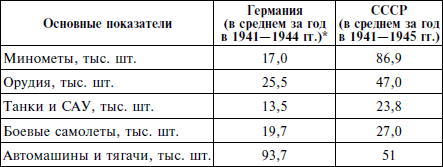 К ноябрю 1941 года, после пяти месяцев войны, германские войска оккупировали экономически развитую часть территории СССР, где проживало 41,9 % всего населения, производилось 33 % валовой продукции всей промышленности, до 71 % чугуна, около 60 % стали, 38 % валовой продукции зерна, а также находилось 47 % всех посевных площадей, около 60 % поголовья свиней и 38 % поголовья крупного рогатого скота[80]. Тем самым экономический потенциал СССР был дополнительно ограничен приблизительно на треть. Однако данные о годовом и среднегодовом производстве вооружений и боевой техники в 1941–1944 годах (см. таблицы 2,3) показывают обратную зависимость по сравнению с соотношением ресурсов (за исключением производства средств транспорта).
