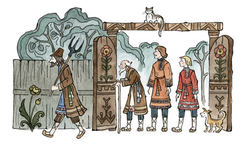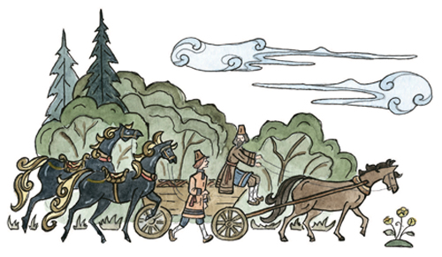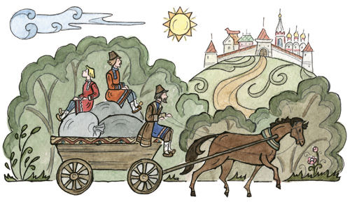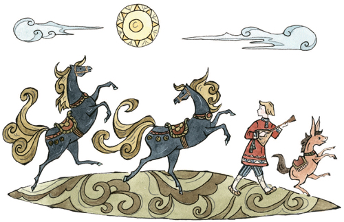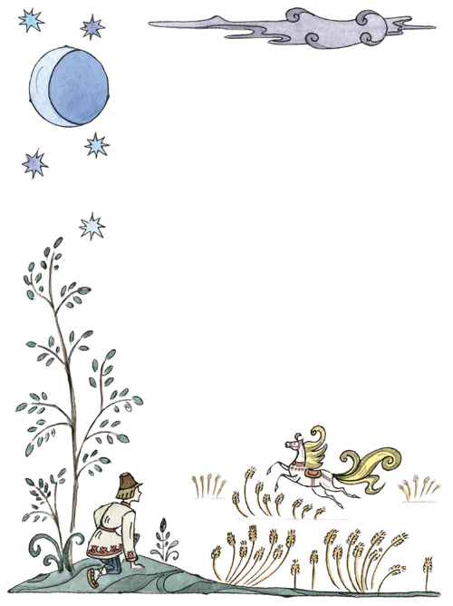 За горами, за лесами,За широкими морями,Не на небе – на землеЖил старик в одном селе.У крестьянина три сына:Старший умный был детина,Средний сын и так и сяк,Младший вовсе был дурак.Братья сеяли пшеницуДа возили в град-столицу:Знать, столица та былаНедалече от села.Там пшеницу продавали,Деньги счётом принималиИ с набитою сумойВозвращалися домой.В долгом времени аль вскореПриключилося им горе:Кто-то в поле стал ходитьИ пшеницу шевелить.Мужички такой печалиОтродяся не видали;Стали думать да гадать —Как бы вора соглядать[1].Наконец себе смекнули,Чтоб стоять на карауле,Хлеб ночами поберечь,Злого вора подстеречь.Вот, как стало лишь смеркаться,Начал старший брат сбираться,Вынул вилы и топорИ отправился в дозор.Ночь ненастная настала;На него боязнь напала,И со страхов наш мужикЗакопался под сенник[2].Ночь проходит, день приходит;С сенника́ дозорный сходитИ, облив себя водой,Стал стучаться под избой:«Эй вы, сонные тетери!Отпирайте брату двери,Под дождём я весь промокС головы до самых ног».Братья двери отворили,Караульщика впустили,Стали спрашивать его:Не видал ли он чего?Караульщик помолился,Вправо, влево поклонилсяИ, прокашлявшись, сказал:«Всю я ноченьку не спал;На моё ж притом несчастье,Было страшное ненастье:Дождь вот так ливмя и лил,Рубашонку всю смочил.Уж куда как было скучно!..Впрочем, всё благополучно».Похвалил его отец:«Ты, Данило, молодец!Ты вот, так сказать, примерно,Сослужил мне службу верно,То есть, будучи при всём,Не ударил в грязь лицом».Стало сызнова[3] смеркаться;Средний брат пошёл сбираться.Взял и вилы и топорИ отправился в дозор.Ночь холодная настала,Дрожь на малого напала,Зубы начали плясать;Он ударился бежать —И всю ночь ходил дозоромУ соседки под забором.Жутко было молодцу!Но вот утро. Он к крыльцу:«Эй вы, сони! Что вы спите!Брату двери отоприте;Ночью страшный был мороз,До животиков промёрз».Братья двери отворили,Караульщика впустили,Стали спрашивать его:Не видал ли он чего?Караульщик помолился,Вправо, влево поклонилсяИ сквозь зубы отвечал:«Всю я ноченьку не спал,Да, к моей судьбе несчастной,Ночью холод был ужасный,До сердцов меня пробрал;Всю я ночку проскакал;Слишком было несподручно…Впрочем, всё благополучно».И ему сказал отец:«Ты, Гаврило, молодец!»Стало в третий раз смеркаться,Надо младшему сбираться;Он и усом не ведёт,На печи в углу поётИзо всей дурацкой мочи:«Распрекрасные вы очи!»Братья ну ему пенять[4],Стали в поле погонять,Но сколь долго ни кричали,Только голос потеряли:Он ни с места. НаконецПодошёл к нему отец,Говорит ему: «Послушай,Побега́й в дозор, Ванюша.Я куплю тебе лубков[5],Дам гороху и бобов».Тут Иван с печи слезает,Малахай[6]свой надевает,Хлеб за пазуху кладёт,Караул держать идёт.Ночь настала; месяц всходит:Поле всё Иван обходит,Озираючись кругом,И садится под кустом:Звёзды на небе считаетДа краюшку уплетает.Вдруг о полночь конь заржал…Караульщик наш привстал,Посмотрел под рукавицуИ увидел кобылицу.Кобылица та былаВся, как зимний снег, бела,Грива – в землю, золотая,В мелки кольца завитая.«Эхе-хе! так вот какойНаш воришко!.. Но постой,Я шутить ведь не умею,Разом сяду те на шею.Вишь, какая саранча!»И, минуту улуча,К кобылице подбегает,За волнистый хвост хватаетИ садится на хребёт —Только задом наперёд.Кобылица молодая,Очью[7] бешено сверкая,Змеем голову свилаИ пустилась, как стрела.Вьётся кру́гом над по