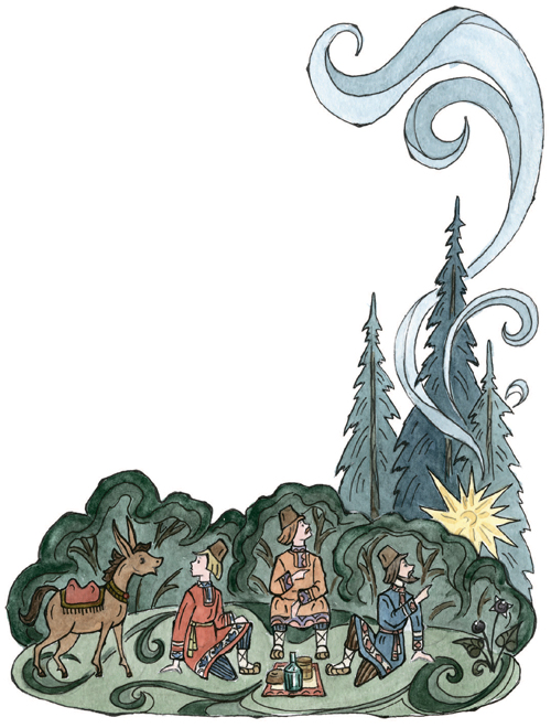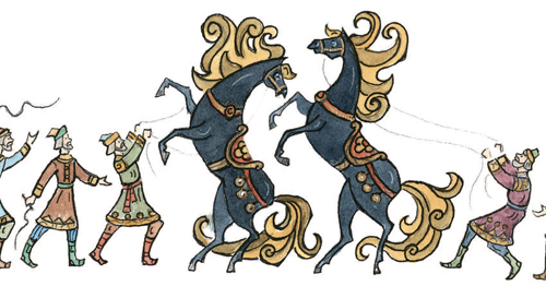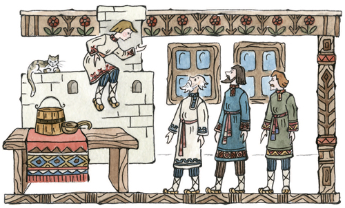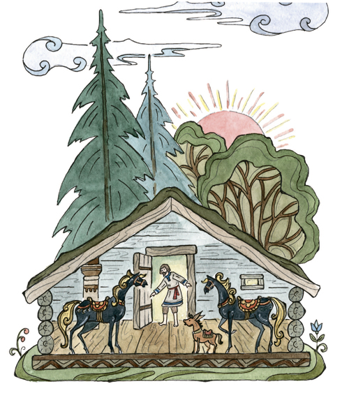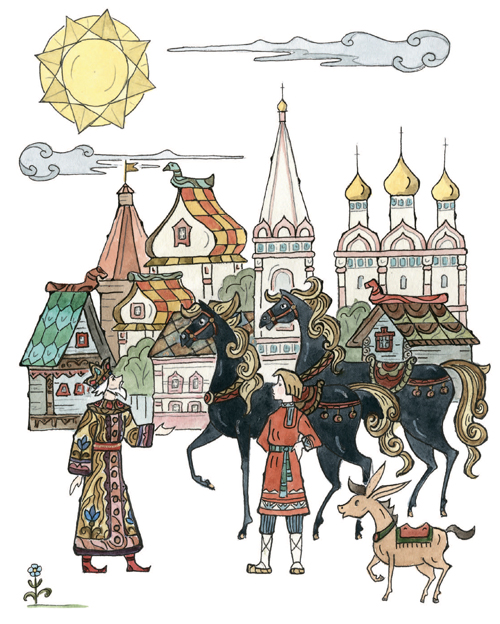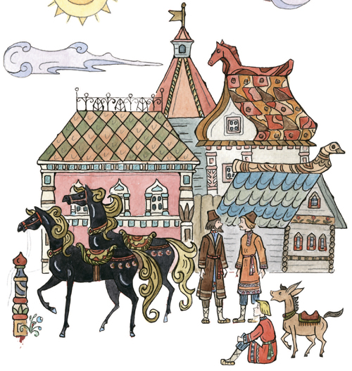 Во дворце я буду жить,Буду в золоте ходить,В красно платье наряжаться,Словно в масле сыр кататься,Весь конюшенный заводЦарь в приказ мне отдаёт;То есть я из огородаСтану царский воевода.Чу́дно дело! Так и быть,Стану, царь, тебе служить.Только, чур, со мной не дратьсяИ давать мне высыпаться,А не то я был таков!»Тут он кликнул скакуновИ пошёл вдоль по столице,Сам махая рукавицей,И под песню дуракаКони пляшут трепака;А конёк его – горбатко —Так и ломится вприсядку,К удивленью людям всем.Два же брата между темДеньги царски получили,В пояски их позашили,Постучали ендовой[35]И отправились домой.Дома дружно поделились,Оба враз они женились,Стали жить да поживатьДа Ивана поминать.Но теперь мы их оставим,Снова сказкой позабавимПравославных христиан,Что наделал наш Иван,Находясь во службе царской,При конюшне государской;Как в суседки[36] он попал,Как перо своё проспал,Как хитро́ поймал Жар-птицу,Как похитил Царь-девицу,Как он ездил за кольцом,Как был на́ небе послом,Как он в солнцевом селеньеКиту выпросил прощенье;Как, к числу других затей,Спас он тридцать кораблей;Как в котлах он не сварился,Как красавцем учинился[37], —Словом: наша речь о том,Как он сделался царём.Часть вторая